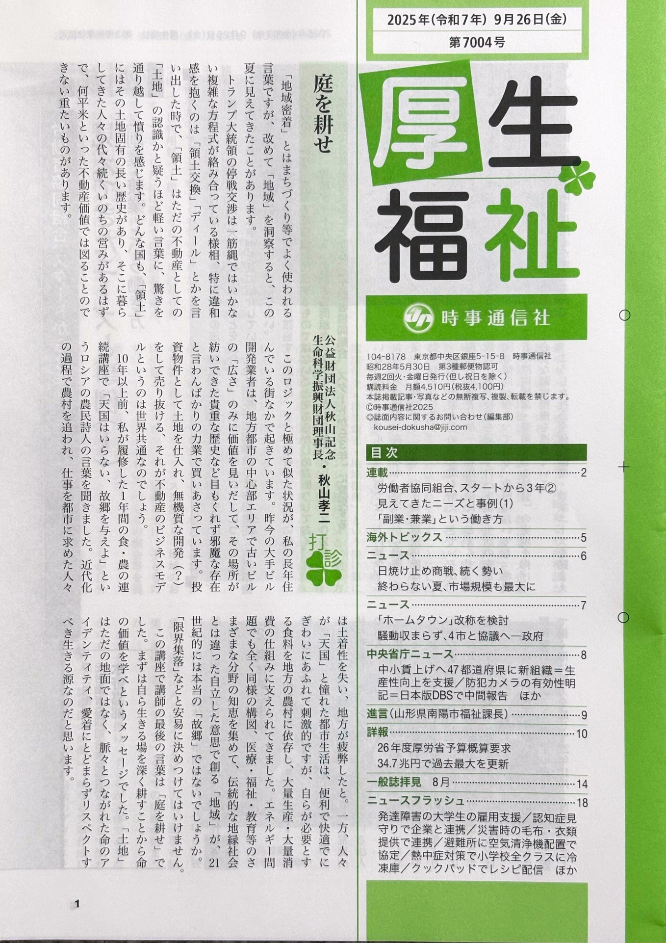 時事通信社週二回発行の『厚生福祉』、表紙の巻頭言を書いて12回目、2025(令和7)年9月26日(第7004号)です。 今回のタイトルは『庭を耕せ』、以前、明峯哲夫さんについての記事でも書いています。