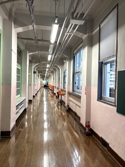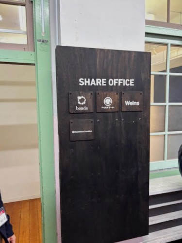 二階にはシェアオフィス、スタートアップ企業のオフィスが入っています。それぞれの部屋に小学校の教室そのままのクラス名、廊下の壁に当時のポスター等がそのまま張ってあり雰囲気を醸し出しています。