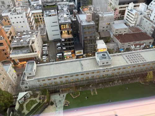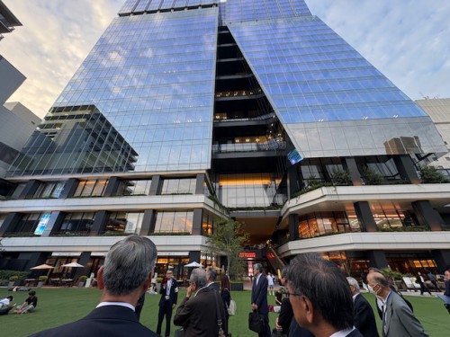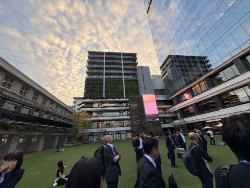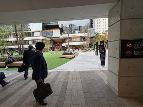 校舎の裏側には広い校庭だった場所に人工芝が敷き詰められ、そこここに若い方たちの団らんの輪ができています。囲むように再開発のオフィスビル群も。