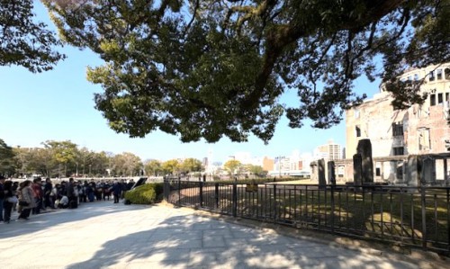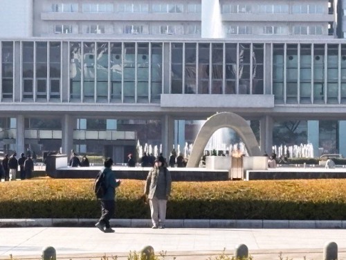 翌日午前中は、市電で原爆ドームと平和公園に、ドーム前では語り部の女性が大勢の日本人の方々に原子爆弾他のお話を分かり易くご説明されていました。