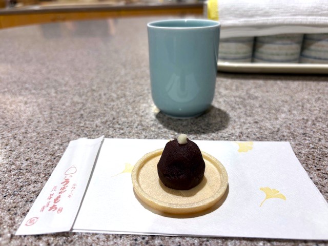 ライブの前に、「うばがもち」の試食、歴史のあるお菓子で戦国時代に遡り、二つ並べて乳母のおっぱいをイメージしているとか!!