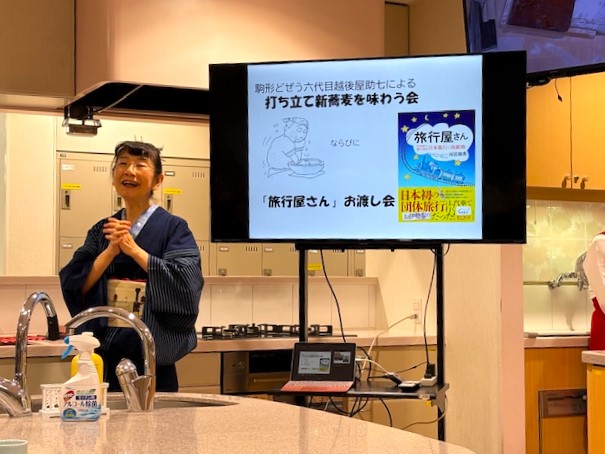 河治和香さんの新著『旅行屋さん』出版記念と浅草の「駒形どぜう」六代目越後屋助七(渡辺孝之)さんの蕎麦打ちライブが、いつものメンバーで北ガスキッチンに集まり、大いに盛り上がりました!!