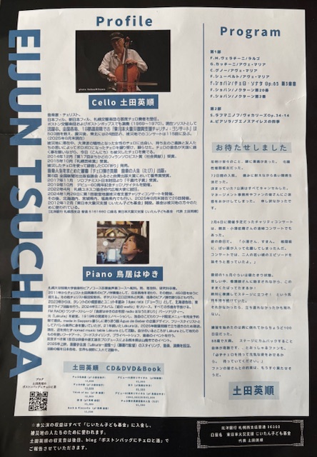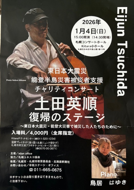 新春を飾るおめでたいお話、昨年病で入院・手術、体調を崩されていたチェリスト・土田英順さんの88歳での復帰・チャリティコンサートが札幌のキタラ小ホールで開催され、お元気な姿と共に渾身の演奏でした。今回のチケットは、娘が私たち夫婦へのお年玉と称して誘ってくれました。